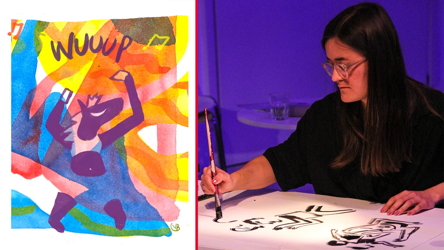 Von einem weißen, leeren Blatt Papier hin zur lebendigen Geschichte: Beim Artist Talk verfolgen Besucher:innen den künstlerischen Schaffensprozess hautnah mit. Spontan lässt Valerie Bruckbög Zeichnungen inmitten des Ausstellungsraums entstehen. Die Arbeit mit Tusche ermöglicht dabei einen fließenden Übergang zur Malerei. Im Gespräch mit Direktor Gottfried Gusenbauer gibt die Wienerin Einblicke in ihren künstlerischen Prozess: Wie entwickeln sich Figuren und Geschichten? Welche Themen treiben die Künstlerin an? Und wie können Comics empowern, inspirieren und gesellschaftliche Fragen sichtbar machen?