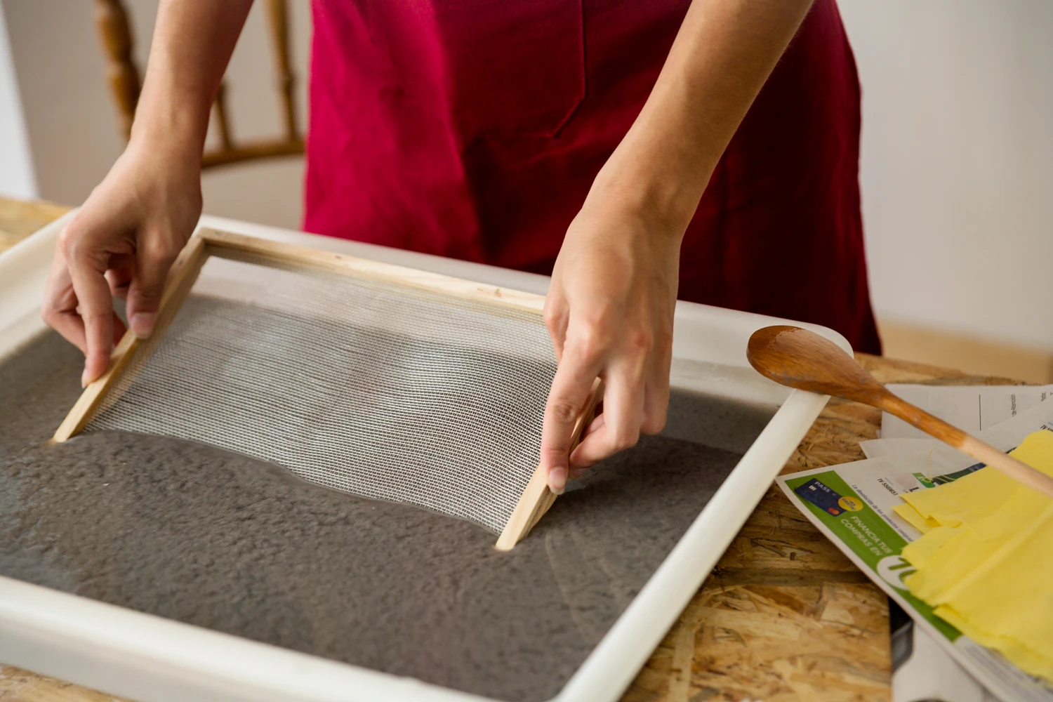 Diesen Samstag werden im Atelier alte Papierreste zu neuem, einzigartigem Papier verarbeitet. Der Prozess umfasst das Schöpfen, Gautschen und Prägen. Dabei wird altes Papier in kleine Stücke gerissen, eingeweicht und zu einer Pulpe verarbeitet. Diese wird in ein Wasserbad gegossen, und der Schöpfrahmen wird vorsichtig eingetaucht. Nach dem Herausheben wird das Papier auf ein Tuch gestürzt, und überschüssiges Wasser wird herausgedrückt.